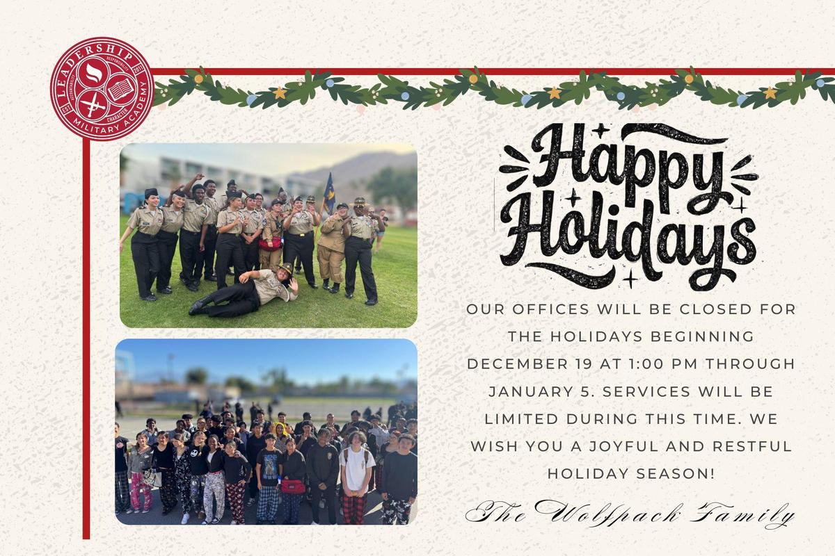 Leadership Military Academy offices will be closed for the holiday break beginning Friday, December 19 at 1:00 PM through Monday, January 5, allowing our staff, students, and their families time to rest and recharge. During this period, services will be limited; however, urgent matters may be directed to Emmanuel Iturbide ([email protected]) or Dr. Herrera ([email protected]), as availability permits. All other inquiries and regular operations will resume on Monday, January 5.